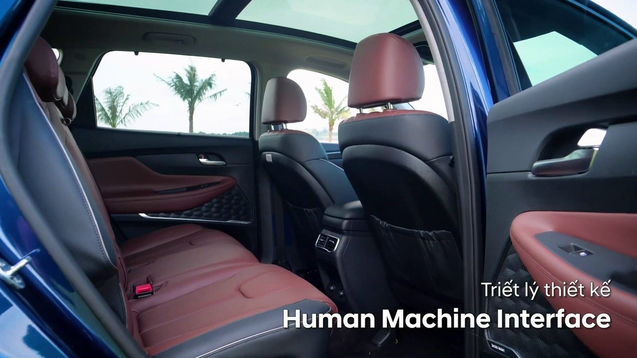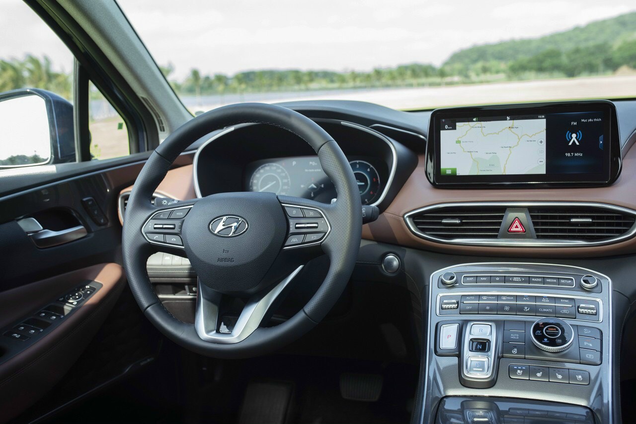 SantaFe mới sở hữu không gian nội thất sang trọng với các đường gân mạnh mẽ tạo thành kết cấu khung vòm liền mạch cho khoang lái. Điểm nhấn ở trung tâm là màn hình cảm ứng 10,25-inch mới được thiết kế mới dạng Fly-Monitor. Màn hình hỗ trợ Android Auto/Apple Carplay, bản đồ định vị dẫn đường vệ tinh dành riêng cho thị trường Việt Nam với nhiều thông tin hữu ích cùng các kết nối giải trí quen thuộc như Bluetooth/Radio FM/AM/AUX/USB hỗ trợ file đa định dạng